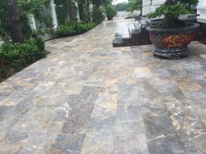 Đá Bazan xám/xanh: Thường có bề mặt khò nhám hoặc băm. Ưu điểm lớn nhất là không thấm nước, không đóng rong rêu, cực kỳ phù hợp cho khu vực sân vườn có tần suất đi lại cao hoặc đỗ ô tô.