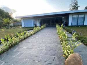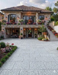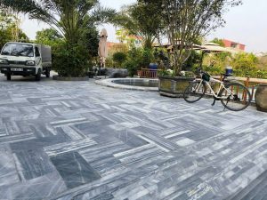 Đá lát sân kích thước 30x60cm là lựa chọn “vàng” trong thiết kế cảnh quan. Tỷ lệ 1:2 này không chỉ giúp không gian trông rộng rãi hơn mà còn rất dễ phối hợp theo nhiều kiểu lát khác nhau (lát công chữ công, lát xương cá, hoặc lát thẳng hàng).