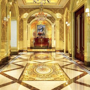 Gạch thảm tiền sảnh được thiết kế ở vị trí trung tâm cùng với những ánh đèn pha lê lấp lánh tạo nên một không gian sang trọng, huyền ảo và hiện đại thu hút mọi ánh nhìn, thể hiện được đẳng cấp của kiến trúc của tòa nhà.