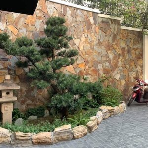 Đá chẻ rối ánh kim ốp tường có kích thước ngẫu nhiên và màu sắc vàng nâu độc đáo khi kết hợp với khung cảnh cây xanh thiên nhiên
