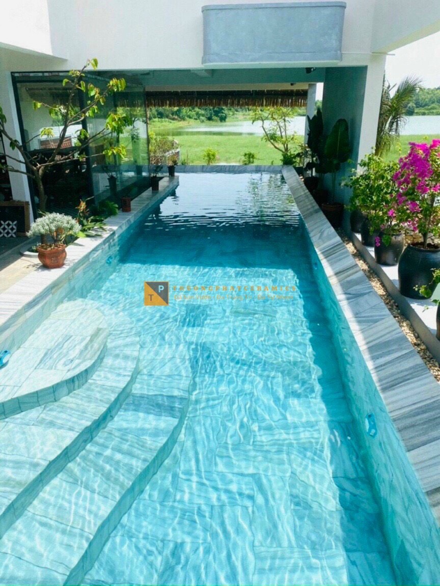 Đá ốp bể bơi được cắt theo nhiều quy cách 15×30, 30×30, 30x60cm…dày khoảng 2cm/2,5cm.