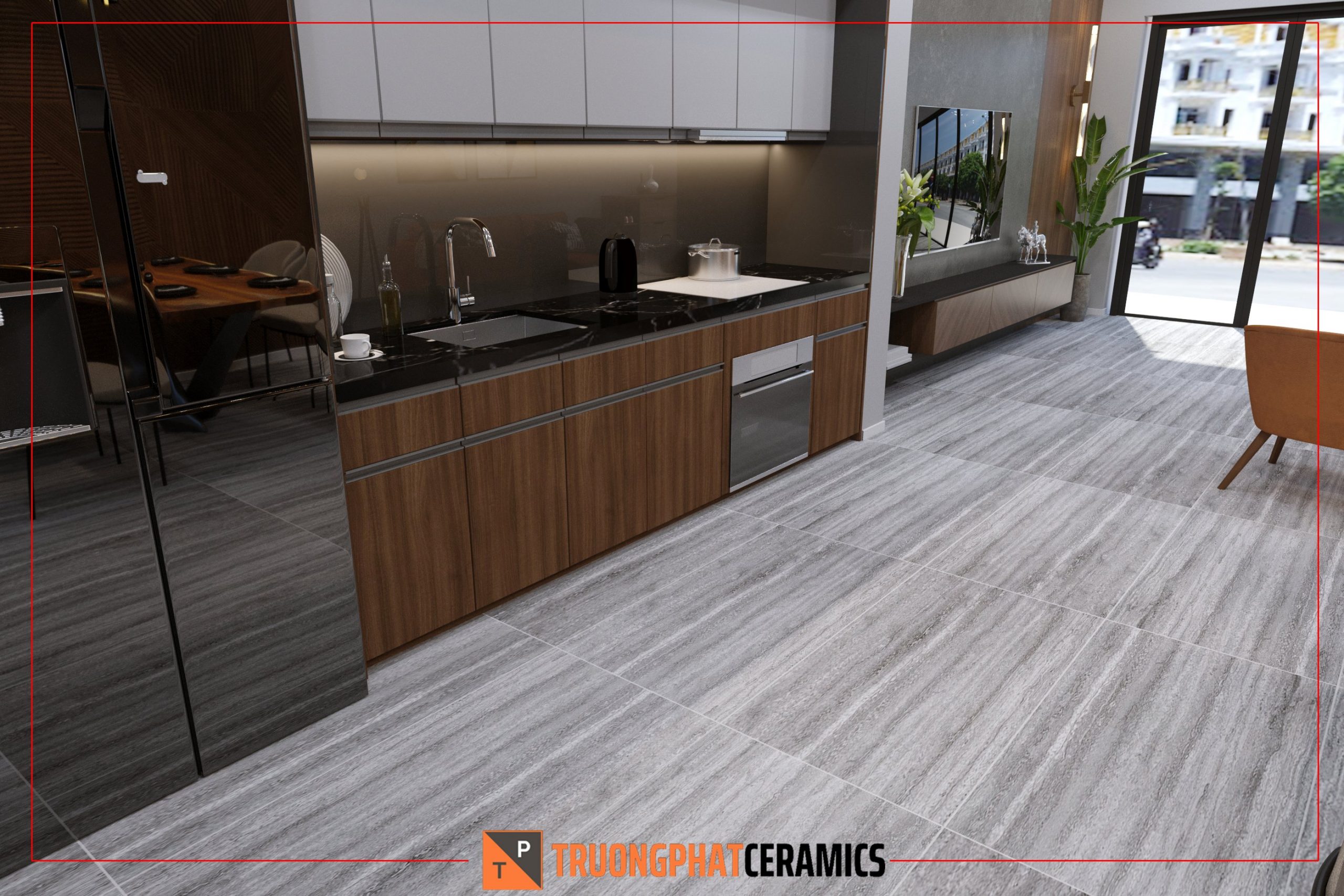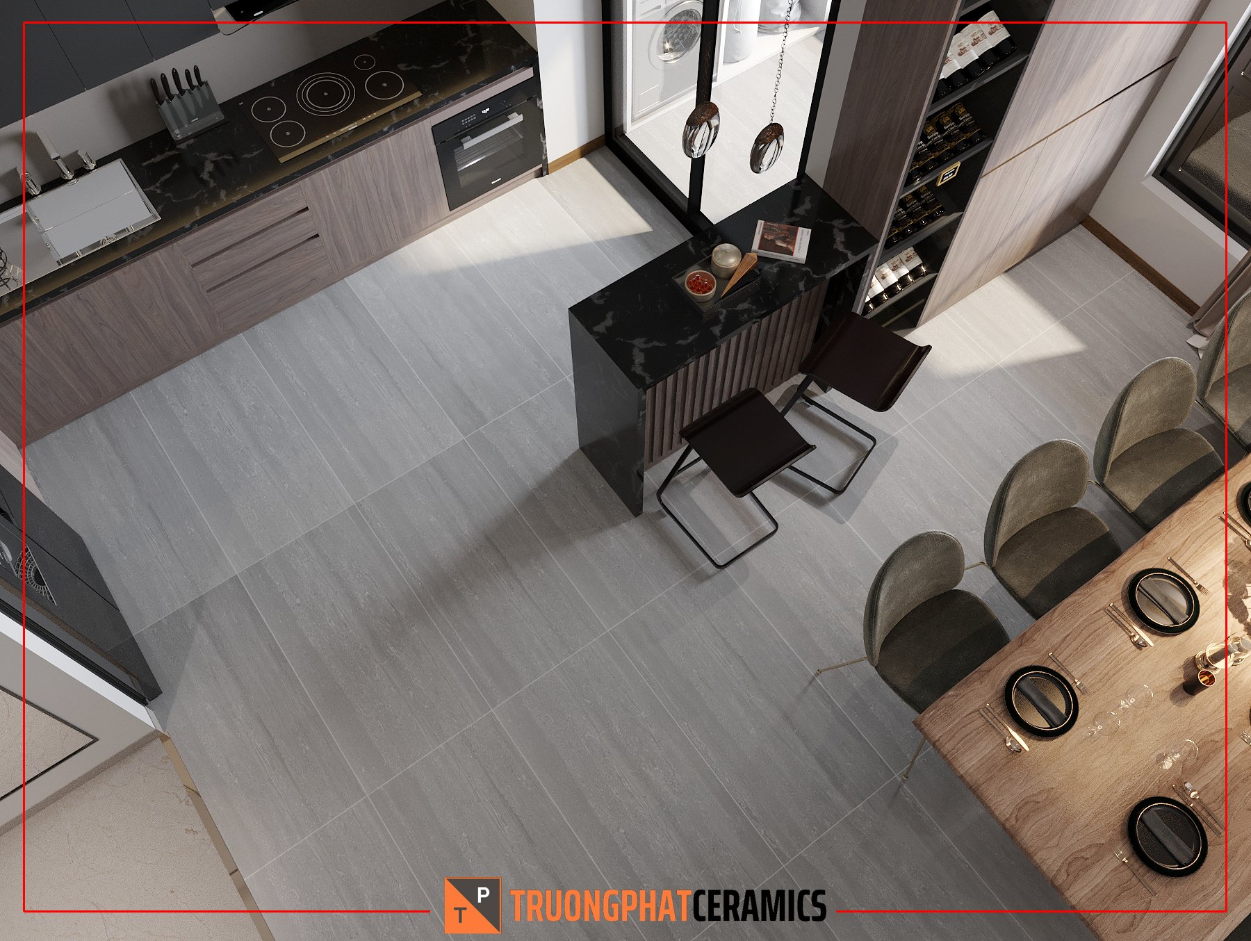 Khu vực này cũng thường xuyên tiếp xúc với dầu mỡ nên chọn loại gạch men hoặc gạch bóng kiếng sẽ dễ dàng lau chùi. Bạn có thể sử dụng gạch kích thước 60x60cm để căn phòng trở nên rộng hơn.